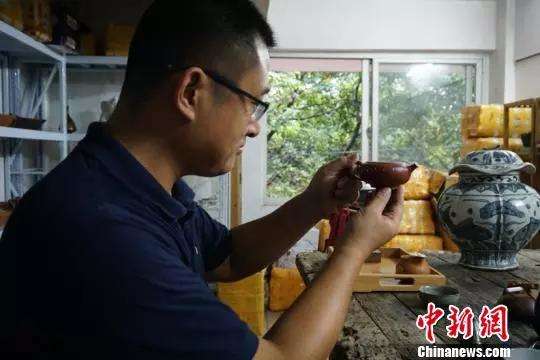 不大的工作室里,有陳建國收藏的紫砂壺,也有客人讓其修復的物件。記者了解到,這是一間基本不對外營業(yè)的工作室,他接的活兒都是經(jīng)朋友口口相傳介紹的。