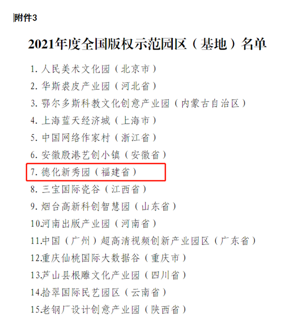 日前,國家版權(quán)局公布了2021年度全國版權(quán)示范單位、示范單位(軟件正版化)和示范園區(qū)(基地)名單。在全國版權(quán)示范園區(qū)(基地)名單上,德化新秀園榜上有名,祝賀!