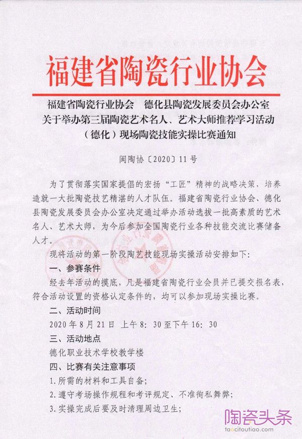 關(guān)于舉辦第三屆陶瓷藝術(shù)名人、藝術(shù)大師推薦學(xué)習(xí)活動(dòng)(德化)現(xiàn)場陶瓷技能實(shí)操比賽通知