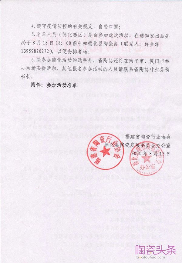 5.名單人員(德化賽區(qū))是否參加此次活動(dòng),在通知發(fā)出后務(wù)必于8月18日18:00前告知德化縣陶瓷辦(聯(lián)系人:許金澤 13959820272),以便安排考場;