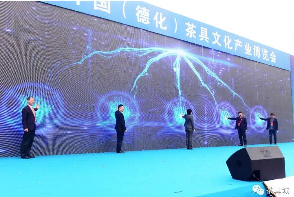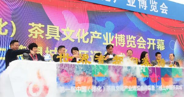 泉州市副市長(zhǎng)周真平宣布“第一屆中國(guó)(德化)茶具文化產(chǎn)業(yè)博覽會(huì)開(kāi)幕”。主席臺(tái)上的領(lǐng)導(dǎo)嘉賓共同啟動(dòng)茶具產(chǎn)業(yè)博覽會(huì)開(kāi)幕暨“線上中國(guó)茶具城”開(kāi)通儀式。