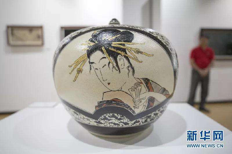 8月6日,在日本橫濱展覽現(xiàn)場拍攝的帶有日本傳統(tǒng)美術(shù)元素的陶瓷作品。