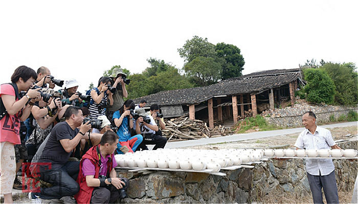 柴燒是德化陶瓷傳統(tǒng)燒制工藝。改革開(kāi)放以來(lái),德化實(shí)現(xiàn)燒瓷電氣化,柴燒窯爐僅存蔡徑村一處了。這里的柴燒陶瓷,已經(jīng)有千百年歷史,窯工們依然守望著傳統(tǒng)的柴燒方式。低矮灰暗的土木結(jié)構(gòu)灰瓦作坊,古老的傳統(tǒng)陶瓷生產(chǎn)工具和工序,亂石和耐火磚混合拱砌的窯爐,還有那憨厚淳樸、因長(zhǎng)年煙熏火燎的古銅色面龐的窯工,使人穿越時(shí)空,仿佛來(lái)到明代宋應(yīng)星《天工開(kāi)物》里的陶瓷作坊。