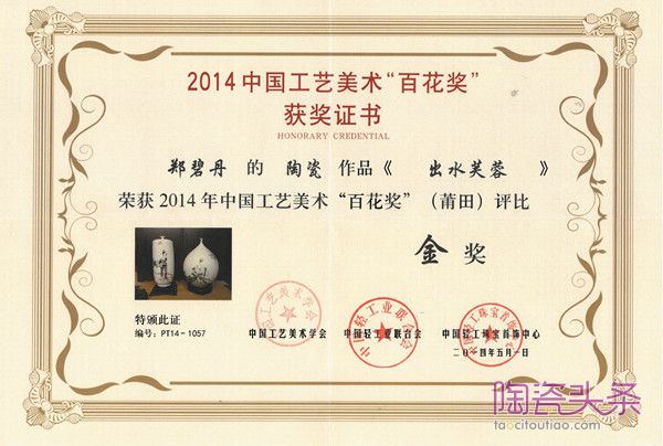 2014年5月《出水芙蓉》榮獲2014年中國(guó)工藝美術(shù)“百花獎(jiǎng)”(莆田)評(píng)比金獎(jiǎng);