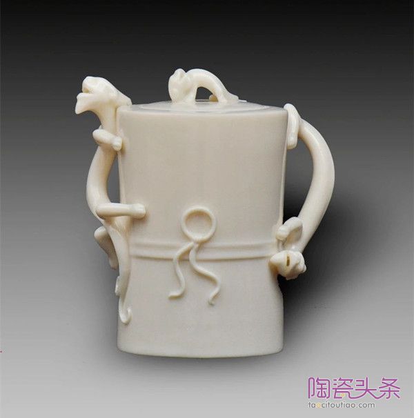 托莫夫先生所收藏的是一件德化白瓷螭龍壺,其胎質(zhì)細膩,通體施白釉,凝如堆脂。圓柱形壺身,巧妙地將變形螭龍制成壺柄及流,并飾有拱形龍鈕蓋,壺身間飾有仿衣飾絳帶,整體造型巧妙,獨具匠心。