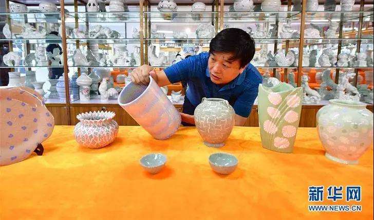 在河南省焦作市修武縣當(dāng)陽(yáng)峪村,“當(dāng)陽(yáng)峪絞胎瓷燒制技藝”國(guó)家級(jí)代表性傳承人柴戰(zhàn)柱采用絞胎技法,將不同花色的泥塊重組在一起。