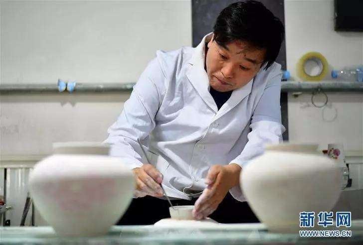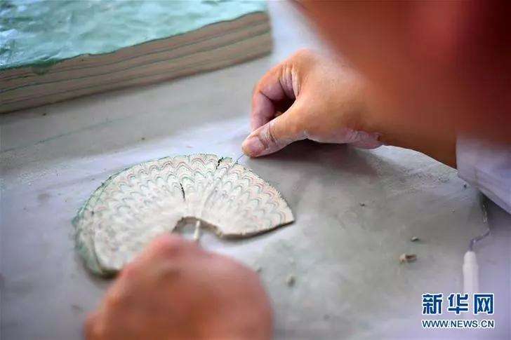 在河南省焦作市修武縣當(dāng)陽(yáng)峪村,“當(dāng)陽(yáng)峪絞胎瓷燒制技藝”國(guó)家級(jí)代表性傳承人柴戰(zhàn)柱在“編織”絞胎瓷的羽毛紋圖案。
