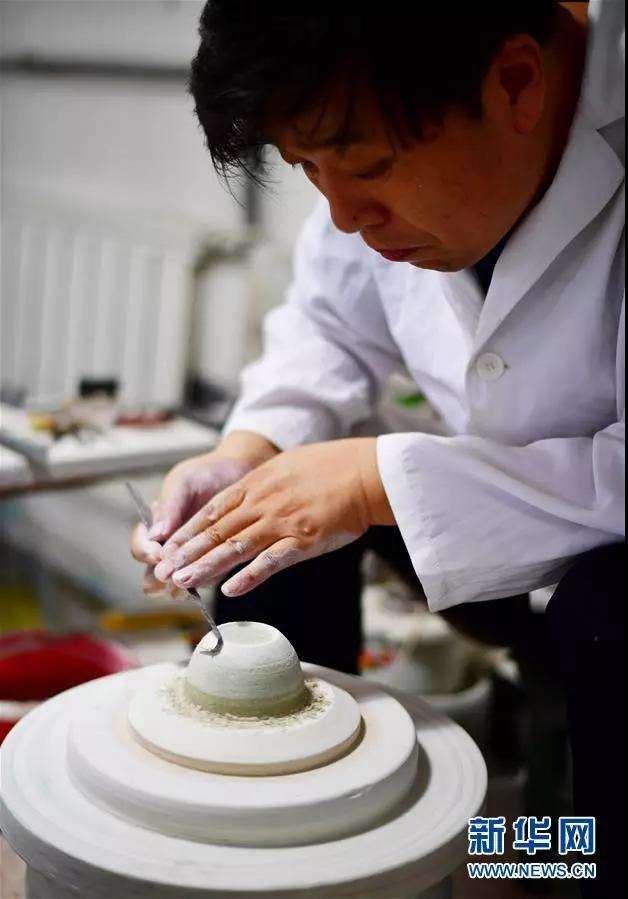 在河南省焦作市修武縣當(dāng)陽(yáng)峪村,“當(dāng)陽(yáng)峪絞胎瓷燒制技藝”國(guó)家級(jí)代表性傳承人柴戰(zhàn)柱在修坯。