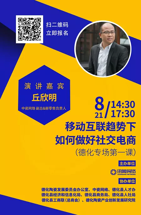 由此,由訊網(wǎng)網(wǎng)絡(luò)主辦,德化縣陶瓷發(fā)展委員會辦公室、德化縣商務(wù)局等單位協(xié)辦的主題為“移動互聯(lián)網(wǎng)趨勢下·如何做好社交電商” 的分享沙龍,將于8月28日在陶瓷街原行政服務(wù)中心三樓(德化縣陶瓷發(fā)展委員會辦公室)舉行,沙龍?zhí)貏e邀請中瓷網(wǎng)絡(luò)副總&新零售負(fù)責(zé)人丘欣明作主題分享。