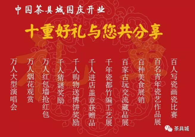 為感謝社會各界多年來對中國茶具城的支持與關(guān)愛,試營業(yè)期間,中國茶具城設(shè)立“十重好禮”,以示酬謝。
