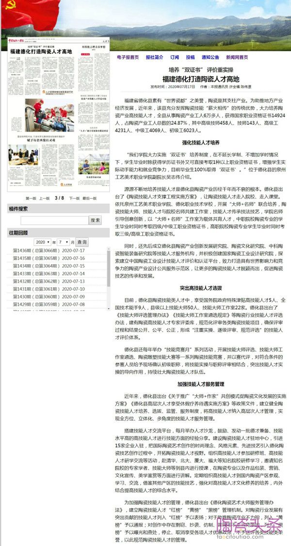 《中國組織人事報》刊發(fā)《培養(yǎng)“雙證書” 評價重實操——福建德化打造陶瓷人才高地》
