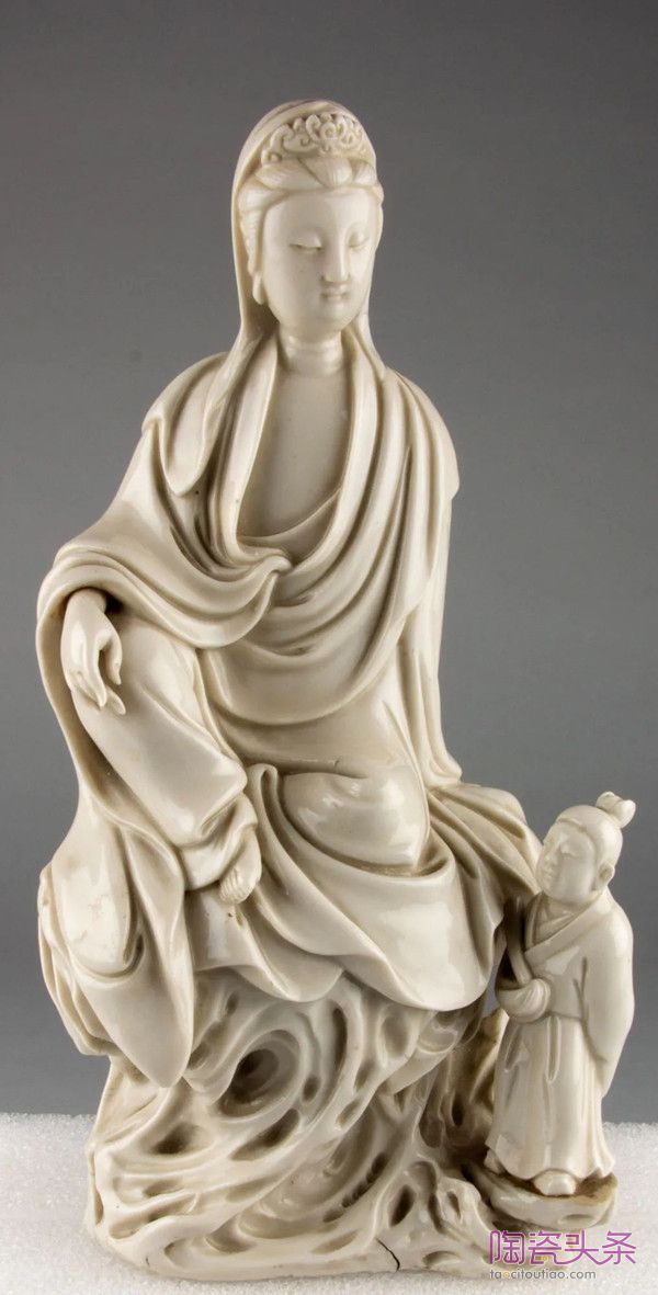 在我國(guó)的瓷器發(fā)展史上,明代德化白瓷具有特殊的地位。觀音像又是德化窯的常見(jiàn)題材之一,以德化瓷細(xì)膩的質(zhì)地和獨(dú)特的象牙白展示其靜美柔曼的風(fēng)韻,慈悲安詳?shù)纳駪B(tài),超凡脫俗的典雅氣質(zhì)、衣紋流暢、表情傳神、形象逼真,胎骨勻稱(chēng)堅(jiān)實(shí),美如脂玉,質(zhì)感性強(qiáng),具有極高的藝術(shù)欣賞價(jià)值。