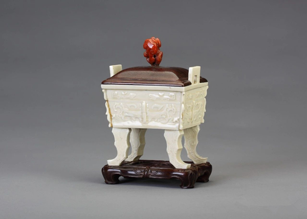 呈長方形,直口,平沿??谘厣狭蓚€對稱的方形板耳,耳穿方形孔,腹下接四曲折狀外撇扁足。長方形腹四角出棱,四面模印紋飾,上部印云雷紋地夔龍紋,下部印饕餮紋。釉色瑩潤呈象牙白色,愈發(fā)襯托出器物的古樸典雅。
