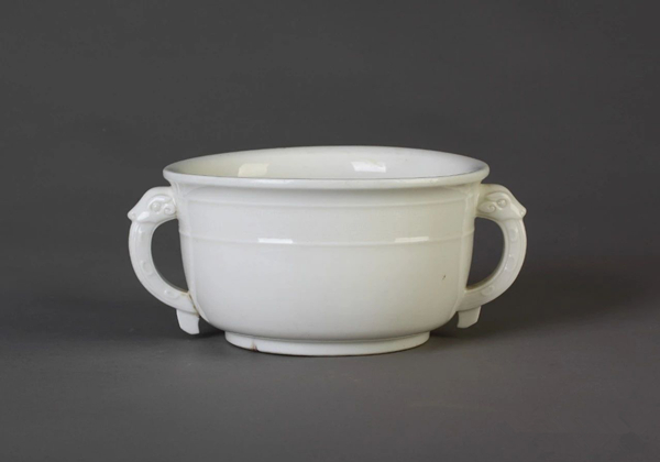 侈口,束頸,鼓腹,高圈足。頸腹間貼附對稱的獸形耳,腹部兩道凸弦紋間模印云雷紋地夔龍紋。這件雙獸耳爐的造型與紋飾都是模仿商周時期的青銅簋,造型規(guī)整,紋飾精美,是德化白瓷仿古類禮器中的精品。