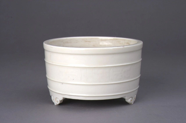 明代白釉印花夔龍紋筒形三足爐,河北博物院藏▲
