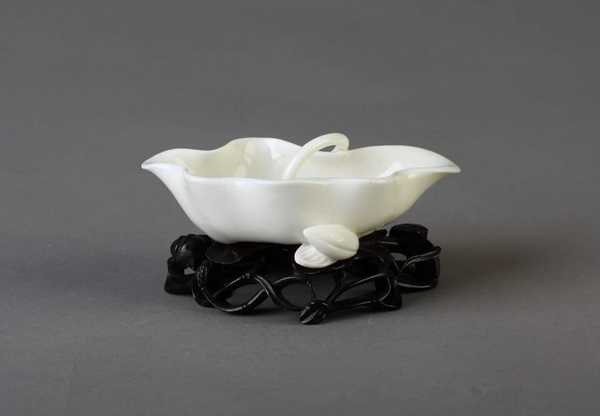 洗呈卷曲的荷葉形,荷葉中心的莖蔓由內向外曲折貼于外壁,另一條莖蔓沿外壁向底部盤曲,從另一端露出含苞待放的花蕾。設計巧妙,造型優(yōu)美,集美觀與實用為一體,是不可多得的案頭雅物。