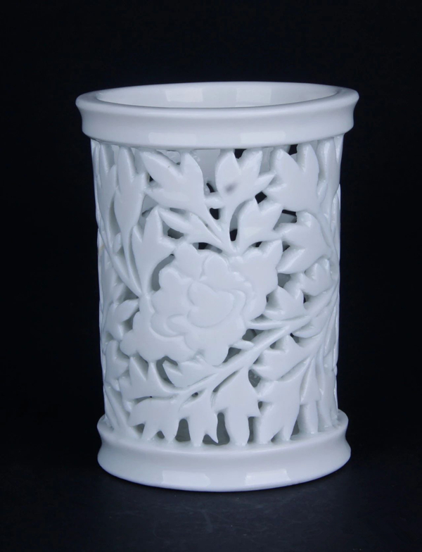 明代白釉鏤雕纏枝牡丹紋筆筒,福建博物院藏▲