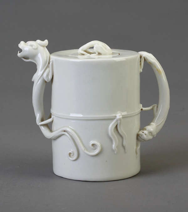 此壺流、柄及蓋鈕均以不同姿態(tài)的螭龍組成,三螭形態(tài)各異,互相呼應,巧妙地與壺身融為一體,突出體現(xiàn)了德化窯高超的造型藝術水平。
