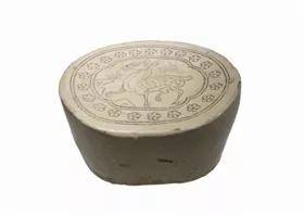另外,以上三件瓷枕,后兩件均采用了戳印工藝。通過與刻花工藝相對照,這種工藝的獨特之處顯而易見。所謂“戳印”,即“戳印填彩”,是用燒制好的瓷印模,在胎上打印圖案。此法借鑒了珍珠地填彩的技法發(fā)展而成,以上述戳模在飾面上戳印之后,印紋內(nèi)填涂棕褐或黑色釉粉,以彰顯畫面的紋飾,器表再施以透明釉。戳印工藝為井陘窯所獨有,是井陘窯窯口代表的裝飾特色。而且,這一技法在金代尤其盛行。井陘窯工匠制作了人物、動物、花卉等形形色色的大小不等的戳模。其中,小型戳模如朵花模、蝴蝶模等,直徑僅半厘米;中等戳模,直徑二到四厘米,有旋子花、折枝花、纏枝花、海獸波濤、樂人擊鼓、擊鈸等;較大的戳模,直徑五厘米以上,有臥鹿、對鹿、奔鹿、奔牛等,大多是配套組合使用。