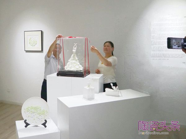 致辭環(huán)節(jié)后,錦江區(qū)文化館館長張紅波先生與古跡酒店負責(zé)人龔媛媛女士進行了現(xiàn)場別樣的剪彩儀式,共同揭開由蘇華羽、曾巧霞夫婦創(chuàng)作的德化白瓷捏花作品紅色彩帶。至此,本次展覽順利開幕!