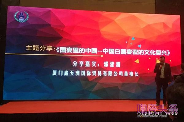 此次大會(huì),廈門(mén)鑫五洲國(guó)際貿(mào)易有限公司作為協(xié)辦單位,其董事長(zhǎng)郭建洲先生作了《國(guó)宴里的中國(guó)——國(guó)宴瓷的文化復(fù)興》的主題分享。綿延5000年的文明從未間斷,從中國(guó)陶瓷的發(fā)展史到的新時(shí)代,賦予了的新征程——從中國(guó)制造到中國(guó)創(chuàng)造。
