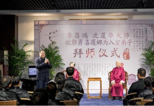 收徒拜師儀式重現(xiàn)中國傳統(tǒng)禮儀,由徒弟郭勇向李昌鴻、沈蘧華大師鄭重遞上拜師帖、獻拜師禮、行拜師禮,最后由師傅李昌鴻親手在拜師帖上親蓋“師道印”并回贈顧脈李門秘傳工具與收徒帖,收郭勇為入室弟子。