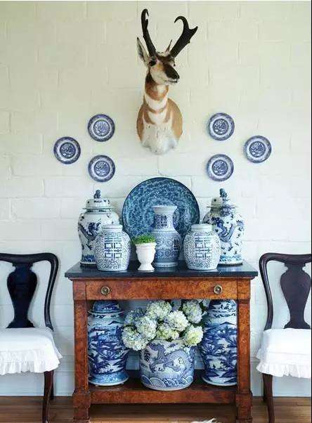 ▲ 墻上、桌上的器皿都統(tǒng)一為藍(lán)白青花瓷風(fēng)格,搭配上簡(jiǎn)單的墻面、復(fù)古的桌椅、清新的花草、和墻上的鹿頭,極具個(gè)性和驚艷感,這樣的風(fēng)格真是大愛。
