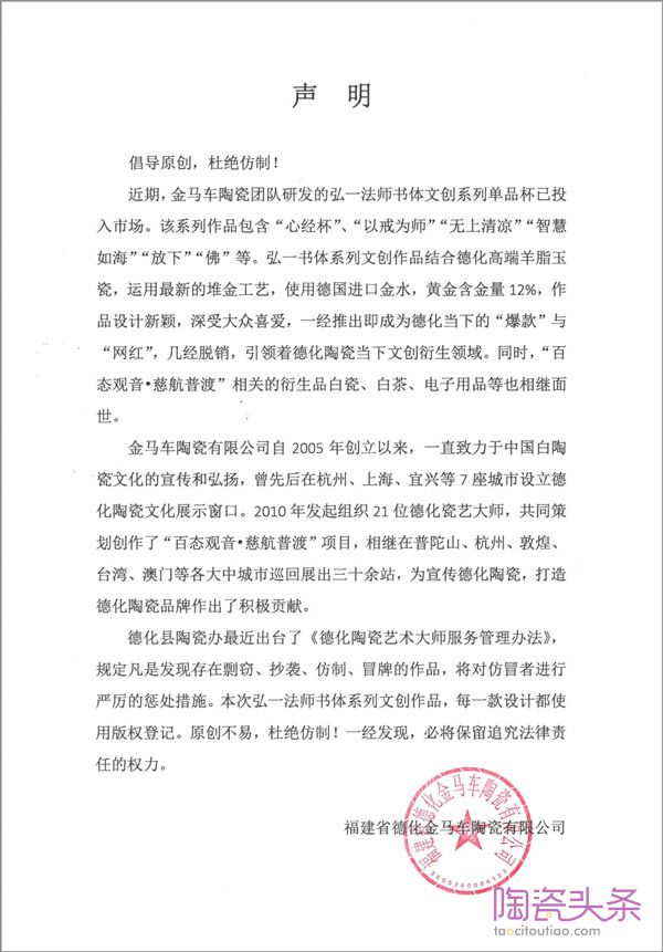德化縣陶瓷辦最近出臺(tái)了《德化陶瓷藝術(shù)大師服務(wù)管理辦法》,規(guī)定凡是發(fā)現(xiàn)存在剽竊、抄襲、仿制、冒牌的作品,將對(duì)仿冒者進(jìn)行嚴(yán)厲的懲處措施。本次弘一法師書(shū)體系列文創(chuàng)作品,每一款設(shè)計(jì)都使用版權(quán)登記。原創(chuàng)不易,杜絕仿制!一經(jīng)發(fā)現(xiàn),必將保留追究法律責(zé)任的權(quán)力。
