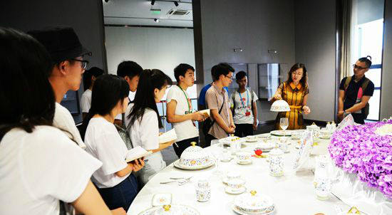 淄博是全國重點(diǎn)陶瓷產(chǎn)區(qū),被譽(yù)為“中國陶瓷名城”、“北方瓷都”,建國后經(jīng)過60余年的科技創(chuàng)新,慢慢從粗陶發(fā)展至骨質(zhì)瓷、華青瓷、高石英瓷等。與景德鎮(zhèn)的藝術(shù)瓷不同,淄博更多的發(fā)展日用瓷,在陶瓷材料研究方面下功夫。7月11日下午,實(shí)踐隊(duì)來到華光國瓷有限公司,走進(jìn)展廳,引入眼簾的便是2014APEC首腦午宴上,由華光國瓷專門為21國首腦設(shè)計(jì)定制的《國彩天姿》。這套瓷器便充分體現(xiàn)了傳統(tǒng)與現(xiàn)代的碰撞,圖案上將傳統(tǒng)的斗彩與歐洲的風(fēng)格相結(jié)合,在造型上既繼承中國傳統(tǒng)的執(zhí)壺等造型,同時(shí)又融入適合西方飲食習(xí)慣的湯盅、雙聯(lián)瓶等器型?!疤沾僧a(chǎn)品要善于改變傳統(tǒng)觀念,適應(yīng)新的要求,跟上時(shí)代的變化。”華光陶瓷公司藝術(shù)總監(jiān)何巖指著展廳里的瓷器說道。