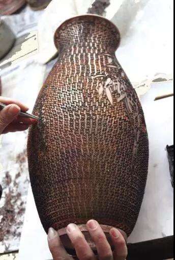 其次,掐絲,用鑷子將壓扁了的細(xì)紫銅絲掐、掰成各種精美的圖案花紋,再蘸上白芨粘附在銅胎上,然后篩上焊藥,經(jīng)900度的高溫焙燒,將銅絲花紋牢牢地焊接在銅胎上。