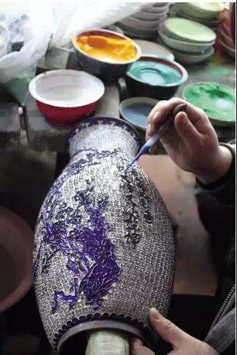 第三,點藍(lán),再經(jīng)燒焊、酸洗、平活、正絲等工序后,進入點藍(lán)工序。藝師把事先備好的琺瑯釉料,用小鏟形工具,一鏟鏟地將琺瑯釉料填充入焊好的銅絲紋飾框架中。第四,燒藍(lán),填滿色釉后,放入約800度的爐火中用白煤燃料烘燒,色釉熔化為液體,冷卻后固著在胎體上。再填色釉,再燒結(jié),連續(xù)四五次,直至將紋樣內(nèi)填到與掐絲紋相平。