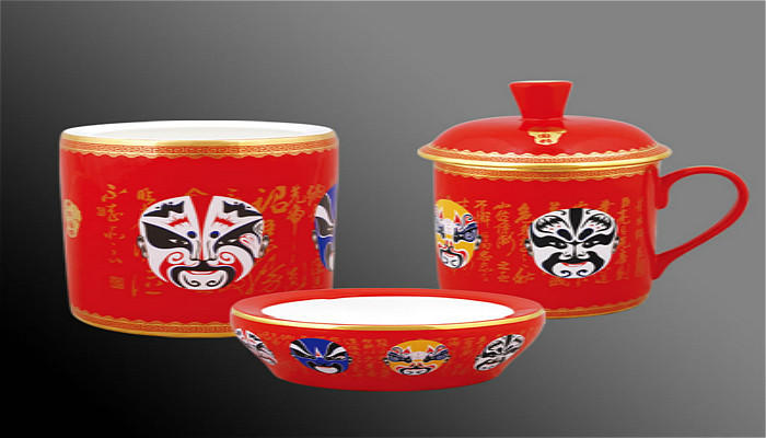 京劇是我國國粹,而京劇中的臉譜既是一種舞臺(tái)化裝,又是一種圖畫藝術(shù),具有很高的欣賞價(jià)值,是中國老百姓非常喜歡的一種藝術(shù)形式。上面這款日用陶瓷三件套中很巧妙地講中國紅與京劇臉譜結(jié)合起來,渲染出一種濃濃的中國民族風(fēng)。