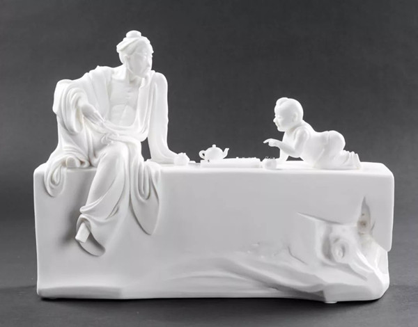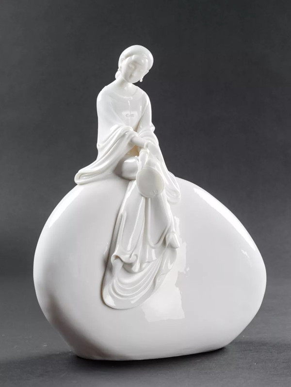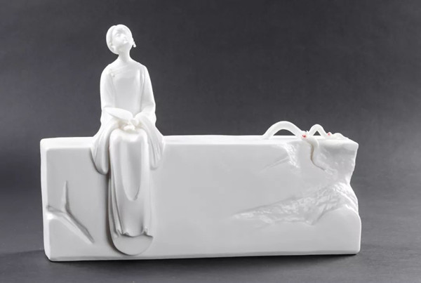 一彎清月攜著幾縷卷云,一片碩大荷葉上的幾朵出水芙蓉,都靜謐地鑲嵌在一顆光滑圓潤(rùn)的巨石上,端坐在石上的仕女輕撫著懷中的古琴,細(xì)膩柔美的衣褶輕輕飄蕩,“琴寄愁思于風(fēng),荷映倩影于月”,這是陳建陽(yáng)的白瓷作品《荷塘月色》展現(xiàn)給觀眾的美好畫面。他堅(jiān)信“藝術(shù)源自于生活”,這件作品的靈感便來(lái)自一次山間游玩所遇見(jiàn)的鵝卵石。光潔如玉的卵石,映于其上的月影和荷花,都給人以無(wú)限遐想和詩(shī)意。