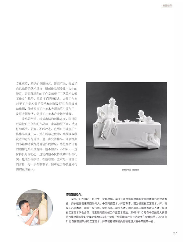 1979年陳建陽(yáng)出生于瓷都德化,德化人心中都有一個(gè)白瓷夢(mèng),為了追逐理想,1996年陳建陽(yáng)來(lái)到“蘊(yùn)玉瓷莊”拜蘇獻(xiàn)忠為師,正式學(xué)習(xí)白瓷雕刻技術(shù)。一晃十四年過(guò)去了,從最基本的泥捏到人物雕塑,從泥稿到成型的白瓷,陳建陽(yáng)勤懇學(xué)習(xí)、腳踏實(shí)地,他追求功到自然成、慢工出細(xì)活的工匠精神。沉醉在瓷雕藝術(shù)的瑰麗與神奇里,陳建陽(yáng)跨越年少的懵懂,轉(zhuǎn)眼變?yōu)槌墒斓那嗄耆??;侍觳回?fù)有心人,陳建陽(yáng)在人物塑造這方面積累了非常豐厚的經(jīng)驗(yàn),觀音、彌勒、達(dá)摩、仕女等作品個(gè)個(gè)惟妙惟肖,活靈活現(xiàn),令人嘆為觀止。