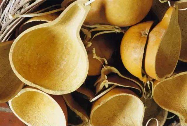 用剖開的葫蘆制成,又有用木頭雕鑿而成,用于舀水。