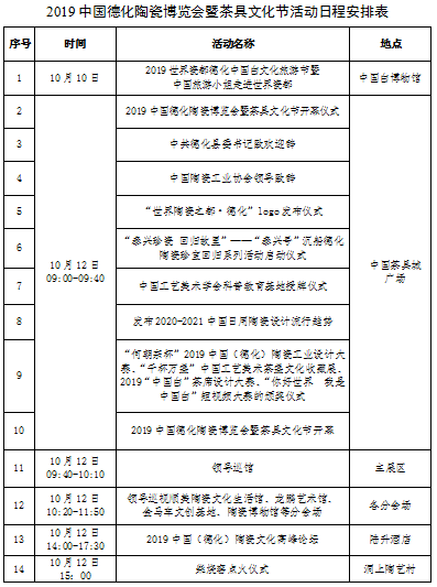 10月12日-15日,2019中國(guó)德化陶瓷博覽會(huì)暨茶具文化節(jié)在中國(guó)茶具城舉辦。10月12日上午9:00在中國(guó)茶具城廣場(chǎng)舉行開幕儀式,歡迎廣大市民蒞臨觀禮!