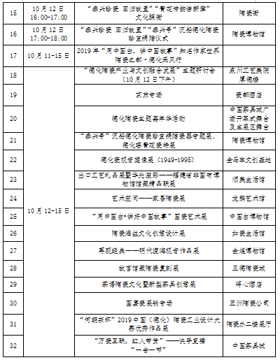 此次“一會(huì)一節(jié)”從10月12日至15日,展期四天,以“·德化瓷”為主題,主展館面積60000平方米,設(shè)立展區(qū)9個(gè),薈萃工藝陶瓷、藝術(shù)陶瓷、家居日用陶瓷,茶配套產(chǎn)品、茶葉精品。設(shè)立陶瓷博物館、金馬車文創(chuàng)基地、順美陶瓷文化生活館、龍鵬藝術(shù)館、博物館等5個(gè)分會(huì)場(chǎng)陶瓷主題展。期間還有30個(gè)相關(guān)活動(dòng)。歡迎廣大市民前往參觀!