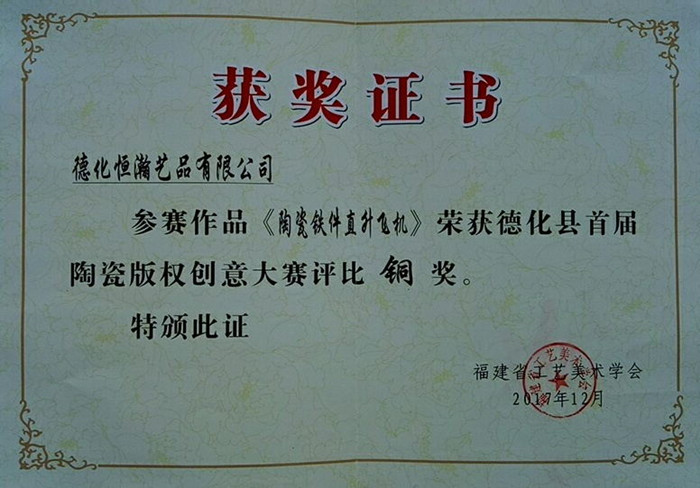 德化恒瀚藝品有限公司位于德化縣潯中鎮(zhèn)詩墩工業(yè)項目區(qū)二期東側(cè),創(chuàng)建于2004年5月,占地面積1.2萬平方米,建筑面積5萬平方米。目前,公司已成為一家集產(chǎn)品研發(fā)、生產(chǎn)貿(mào)易為一體的高度外向型企業(yè),自營出口創(chuàng)匯連年位居全縣前十名。公司主要生產(chǎn)陶瓷工藝品,產(chǎn)品銷往歐洲、北美和東南亞等國家和地區(qū)。近幾年來,公司取得發(fā)明專利5項,實用新型專利23項、知識產(chǎn)權(quán)管理體系認(rèn)證證書,獲得兩化融合管理體系貫標(biāo)評定認(rèn)證,并先后被評為“守合同重信用”單位、“中國陶瓷行業(yè)名牌”稱號、福建省科技型企業(yè)稱號、福建省科技小巨人領(lǐng)軍企業(yè)、福建省高新技術(shù)企業(yè)和國家高新技術(shù)企業(yè)。