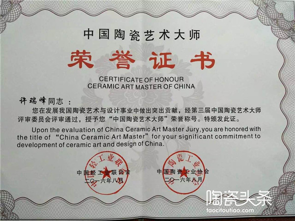《“多彩結(jié)晶釉”大瓷瓶》在2002年5月第三屆福建省工藝美術(shù)精品“爭艷杯”大賽中榮獲金獎;