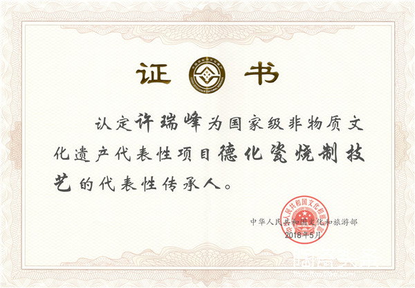 許瑞峰,1969年生于福建省德化縣,是許氏瓷塑第六代傳人?,F(xiàn)為中國陶瓷藝術(shù)大師、非物質(zhì)文化遺產(chǎn)(德化瓷燒制技藝)國家級傳承人、高級工藝美術(shù)師、泉州市優(yōu)秀拔尖人才。福建省商學(xué)院,泉州工藝美術(shù)學(xué)院、泉州市信息工程學(xué)院講座教授、福建省工藝美術(shù)協(xié)會副會長、福建省陶瓷工業(yè)協(xié)會副會長、德化縣政協(xié)常委。