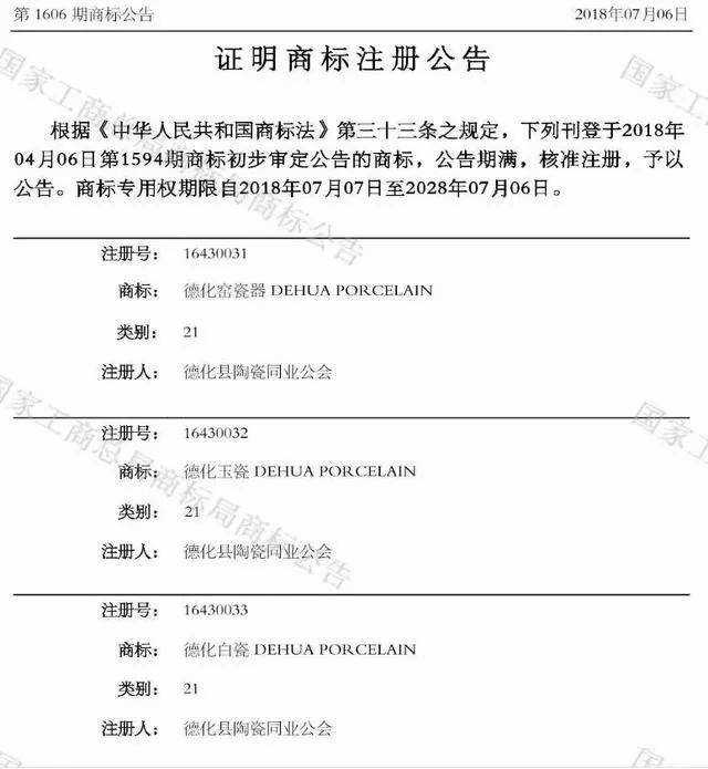 “德化白瓷”“德化玉瓷”“德化窯瓷器”成功注冊地理標志商標