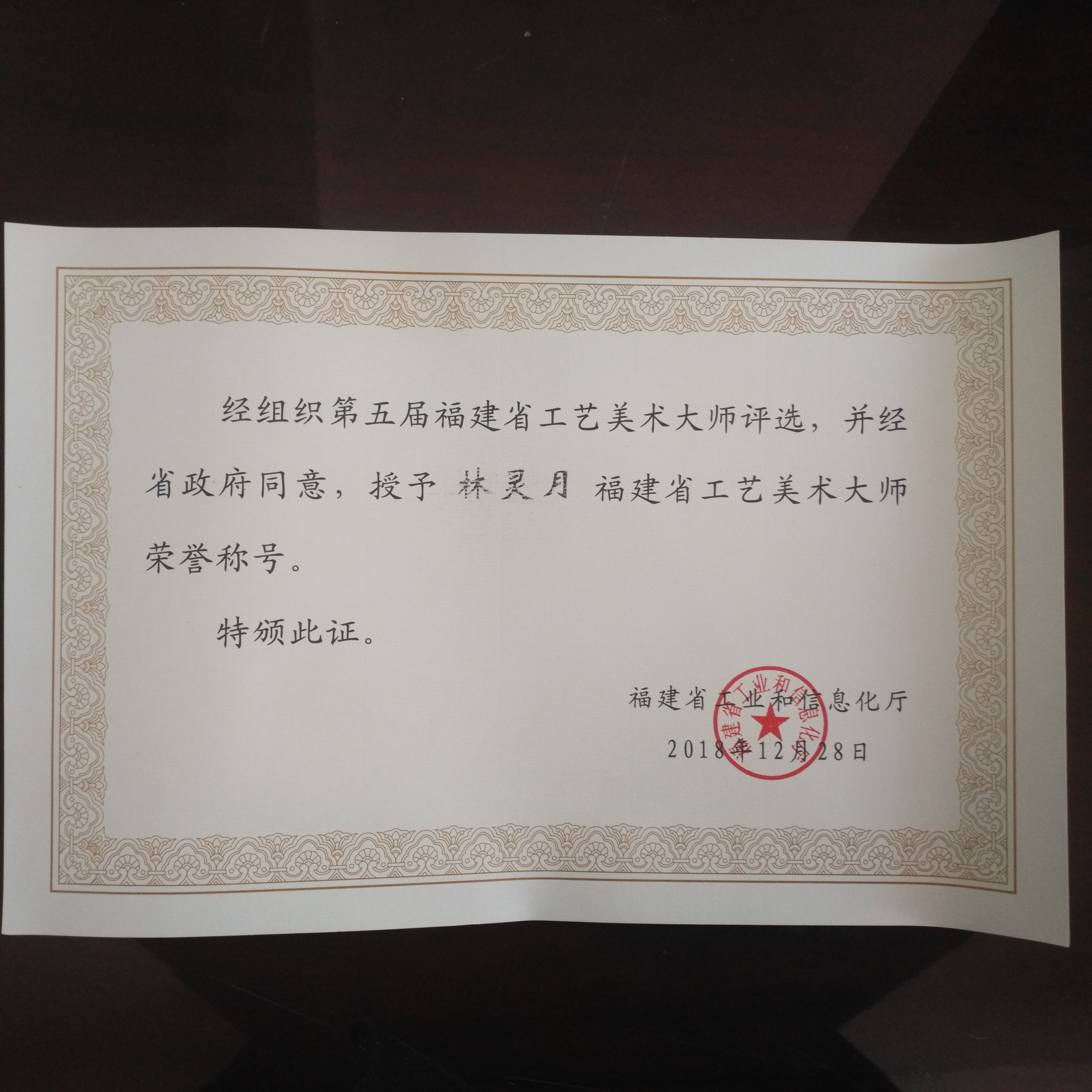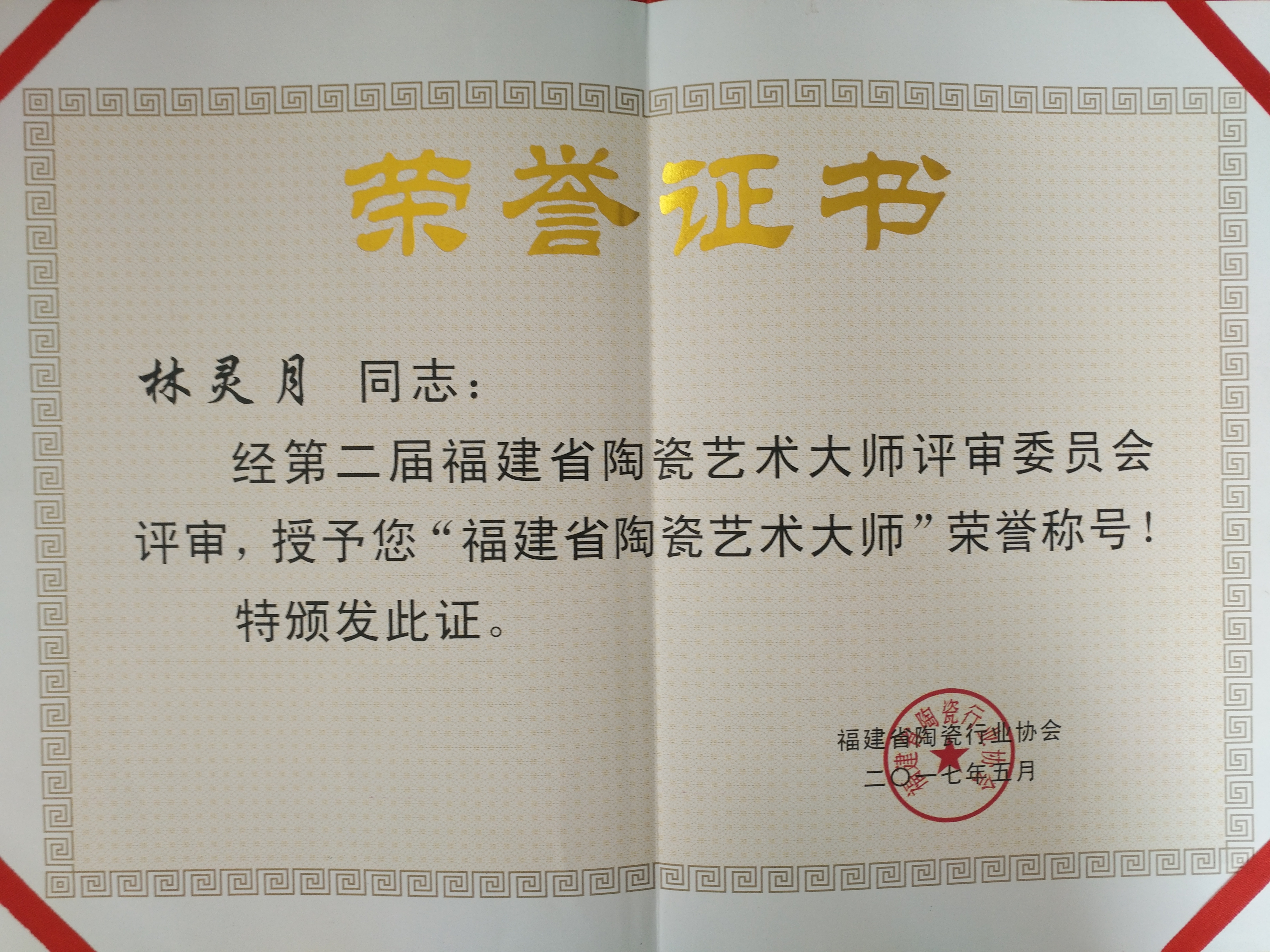 林靈月,女,1980年7月出生于福建省德化縣,學(xué)歷大專,2015年6月畢業(yè)于泉州工藝美術(shù)職業(yè)學(xué)院雕塑藝術(shù)設(shè)計(jì)專業(yè),現(xiàn)為福建省工藝美術(shù)大師、福建省陶瓷藝術(shù)大師、國家一級/高級技師,泉州市工藝美術(shù)大師、全國技術(shù)能手、中國陶瓷行業(yè)技術(shù)能手、福建省巾幗標(biāo)兵、國家職業(yè)技能鑒定高級考評員,德化縣韻瓷軒陶瓷藝術(shù)有限公司藝術(shù)總監(jiān),福建省工藝美術(shù)學(xué)會(huì)會(huì)員,福建省陶瓷行業(yè)協(xié)會(huì)理事,福建省手工藝協(xié)會(huì)理事,泉州市工藝美術(shù)協(xié)會(huì)會(huì)員。