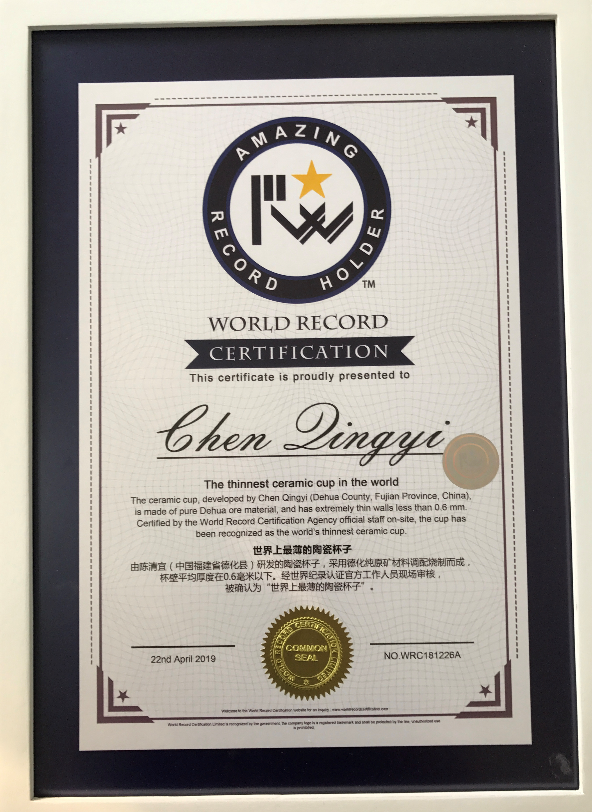 陳清宜總是喜歡不斷嘗新,在熟練掌握常規(guī)杯體的創(chuàng)作之后,他開始挑戰(zhàn)薄胎杯。今年4月22日,他成功燒成0.5mm薄胎杯,成為德化最薄陶瓷杯記錄的保持者。而當(dāng)時(shí)挑戰(zhàn)之初,陳清宜也只是抱著試試的心態(tài)。“我當(dāng)時(shí)就是想挑戰(zhàn)一下景德鎮(zhèn)的最薄陶瓷杯,我也不清楚自己能不能成功?!标惽逡俗叩秸构裆希闷鹨粋€(gè)薄胎杯對(duì)記者說(shuō)道。