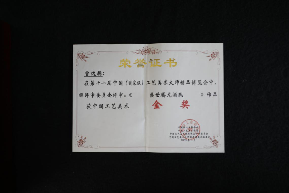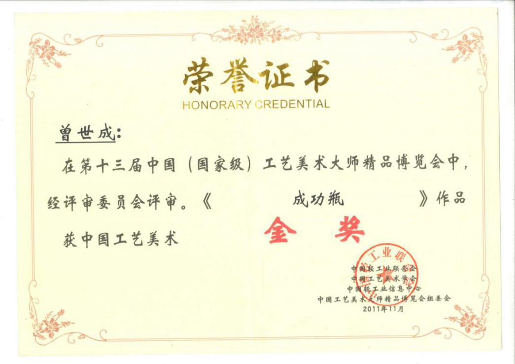 2011年11月作品《成功瓶》在第十三屆中國(國家級)工藝美術(shù)大師精品博覽會中榮獲中國工藝美術(shù)金獎;