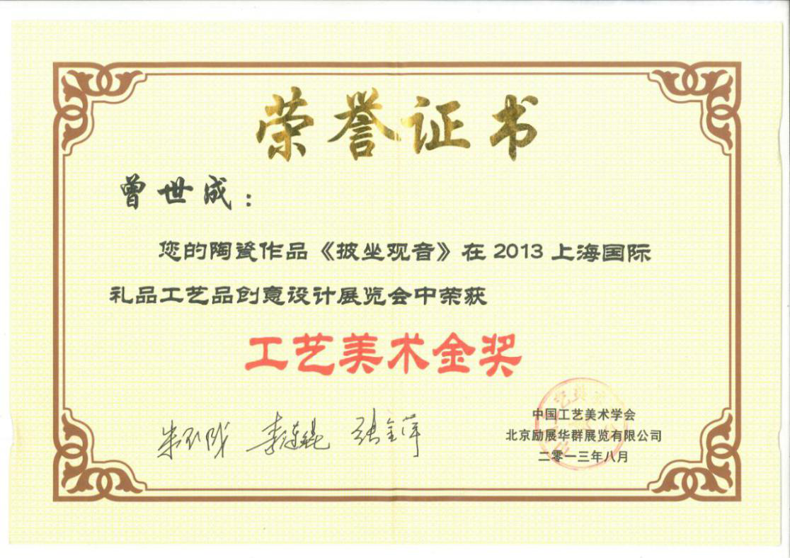2013年8月作品《披坐觀音》在上海國際禮品工藝品創(chuàng)意設計展覽會中榮獲工藝美術(shù)獎;