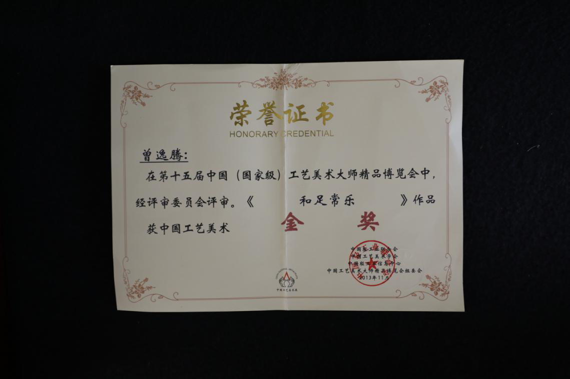 2013年《知足常樂》獲第十五屆中國(國家級)工藝美術(shù)大師精品博覽會中國工藝美術(shù)金獎;
