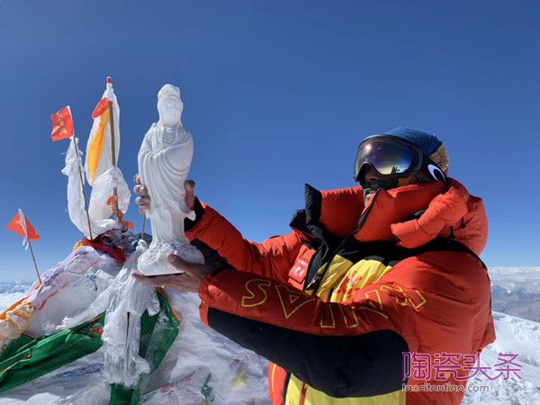 近日,德化有一位叫曾憲杰的小伙子,不遠(yuǎn)千里,從家鄉(xiāng)德化背了一件代表性的白瓷作品《渡海觀音》,前往新疆,攀登海拔7514米的慕士塔格高峰,并克服重重艱險(xiǎn),成功登頂山峰。當(dāng)他把《渡海觀音》拿出來與雪峰合影時(shí),不禁引來同行旅伴的圍觀。潔白無瑕、莊嚴(yán)肅穆的《渡海觀音》塑像,在這高山面前,越顯圣潔與偉大。它就如同這雪峰一般,純粹無暇,偉岸神圣,讓人心生敬畏。
