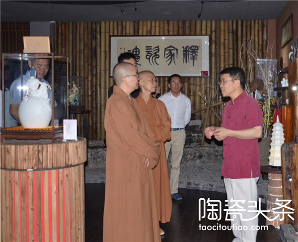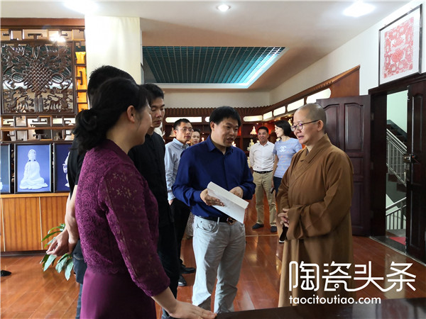 每到一處,如常法師都仔細(xì)觀看大師作品,對(duì)德化白瓷的材質(zhì)美、工藝美表示贊嘆,尤其對(duì)德化佛教題材的陶瓷藝術(shù)品創(chuàng)作表示肯定,認(rèn)為德化不愧是“瓷觀音的故鄉(xiāng)”,各種瓷觀音造像形態(tài)各異、各臻其美,并根據(jù)佛像創(chuàng)作的儀軌等給德化的工藝大師們提出了許多寶貴的意見(jiàn)和建議。如常法師對(duì)德化白瓷茶器也饒有興致,認(rèn)為純白顏色的茶器似玉非玉勝于玉,不僅是良好的飲茶器具,還是絕好的佛前供器,希望能開(kāi)發(fā)出更多品類(lèi)的佛教用品。