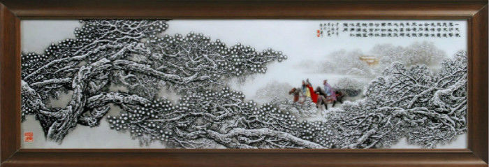 粉彩雪景是清末民國初年流傳下來的瓷器品種,是陶瓷藝苑中一株奇葩。粉彩雪景綜合傳統(tǒng)粉彩、墨彩和琺瑯彩的多種工藝,吸收了西洋油畫技巧,用簡單的黑、白色彩,表現(xiàn)雪景的層次和細節(jié),既有傳統(tǒng)粉彩細膩粉潤的特點,又有西洋油畫藝術(shù)的立體感和層次感,豐潤雅致,意境深遠。其難度在于,在白色的瓷器上,要表現(xiàn)出白雪的層次感,這需要深厚的繪畫功力,還要在創(chuàng)作掛滿白雪的松樹等細部場景時,采用工筆畫法。粉彩雪景曾興盛一時,出過很多大師,像“珠山八友”之一何許人和其弟子余文襄等,都深受收藏家和鑒賞者的喜愛。