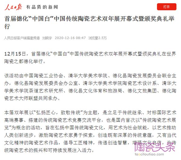 2020年12月15日,首屆德化“”中國傳統(tǒng)陶瓷藝術(shù)雙年展開幕式暨頒獎典禮在被譽(yù)為“世界陶瓷之都”的福建省泉州市德化縣舉行。該活動以“弘揚(yáng)匠心,致敬傳統(tǒng)”為主題,由中國陶瓷工業(yè)協(xié)會、清華大學(xué)美術(shù)學(xué)院、德化縣陶瓷發(fā)展委員會聯(lián)合主辦。